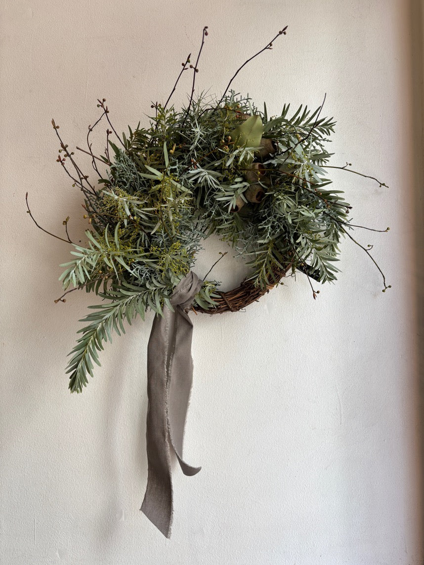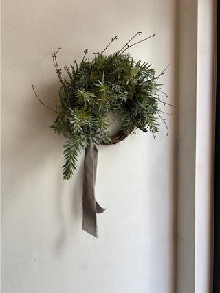 針葉樹がほんのり香る長く飾れる通年リースです。